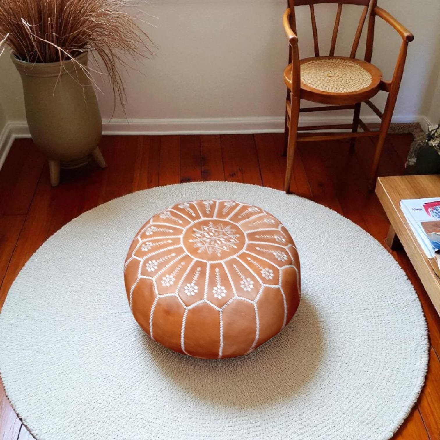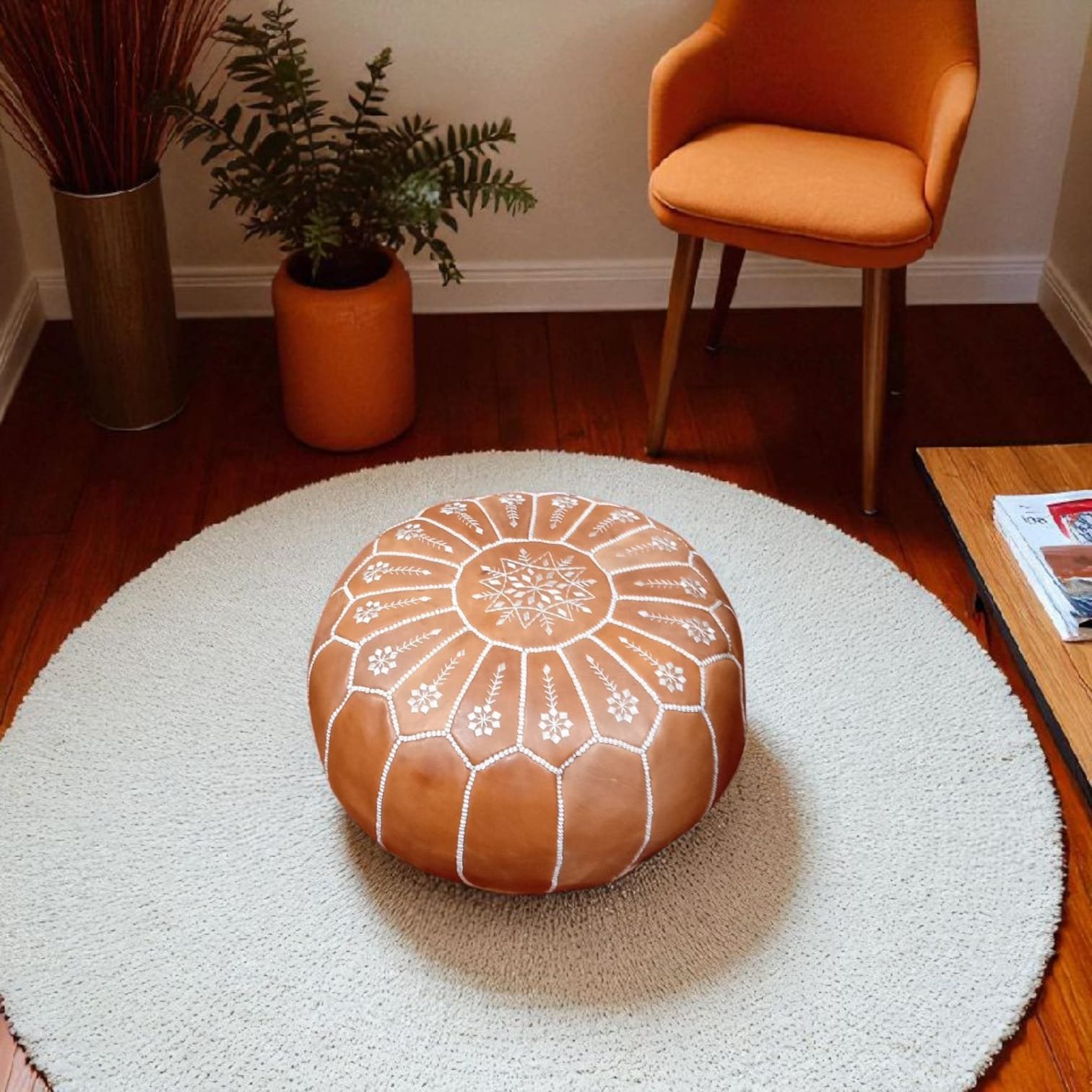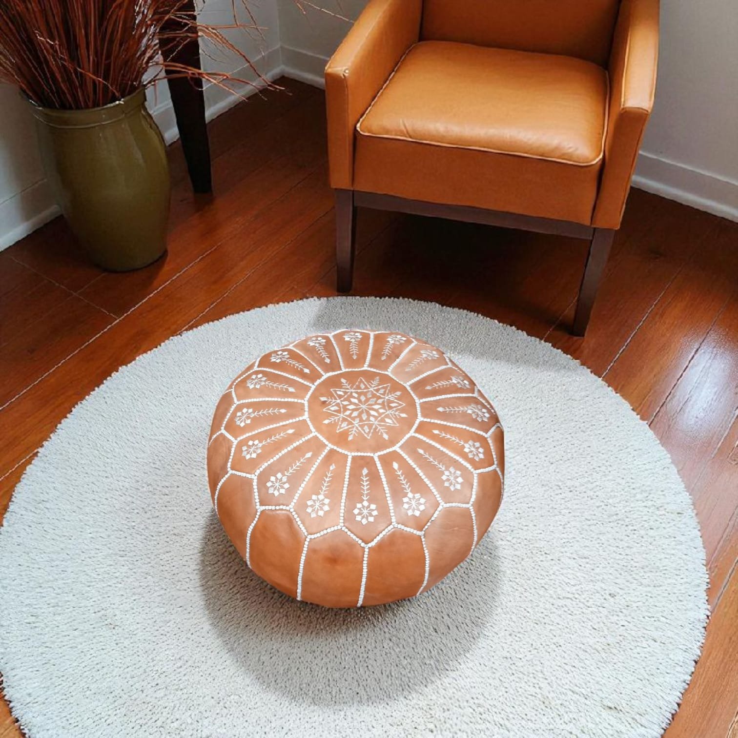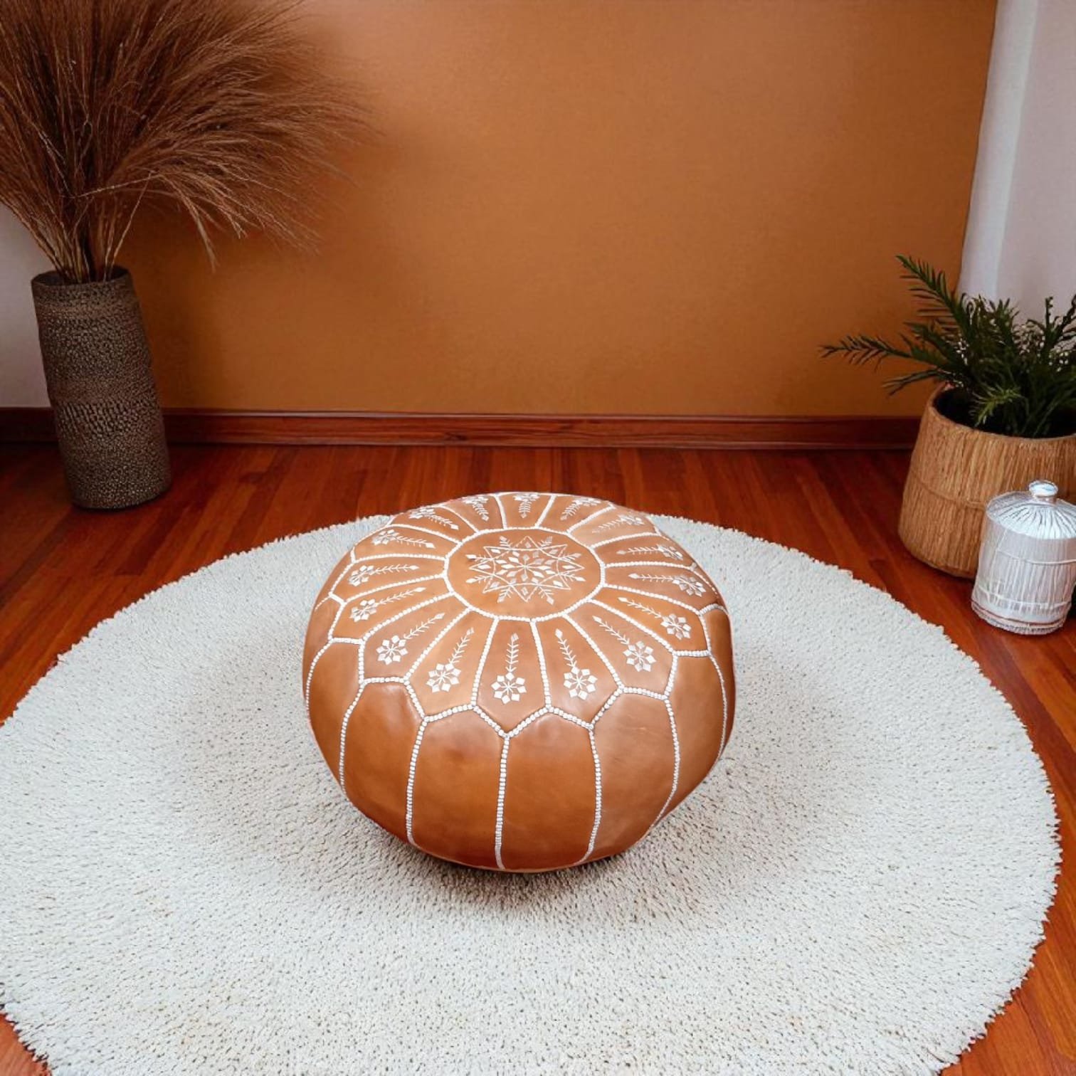 Ce pouf en cuir naturel de 50 cm est une pièce incontournable pour les amateurs de décoration intérieure. Fait main par des artisans marocains, il allie qualité, durabilité et charme intemporel. Avec son design polyvalent, il s’adapte parfaitement à tout style d’intérieur, que ce soit pour un salon, une chambre ou un espace détente. Idéal comme siège d’appoint, repose-pieds ou élément décoratif, ce pouf est un choix alliant fonctionnalité et esthétique. Pouf livré sans rembourrage (remplissage).
