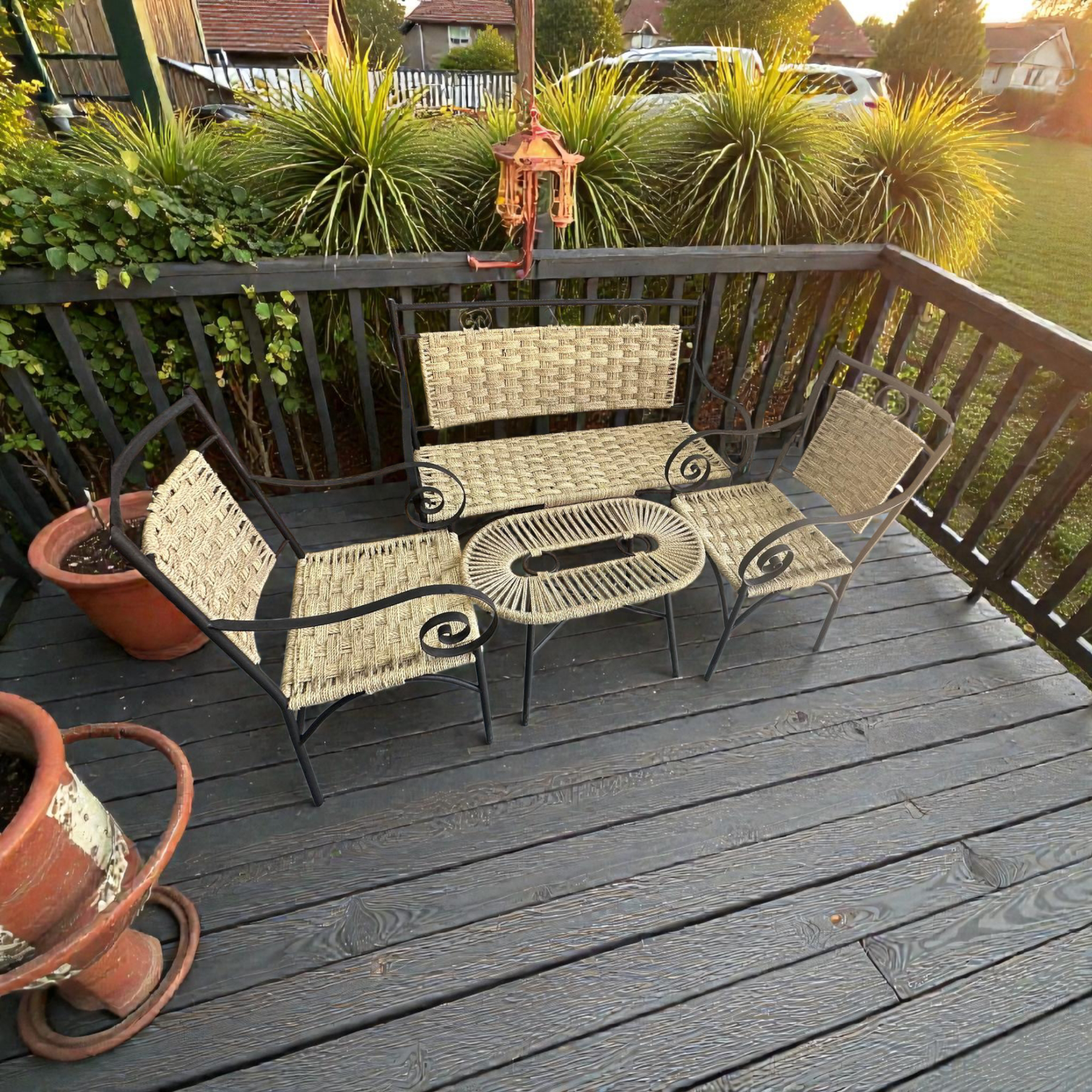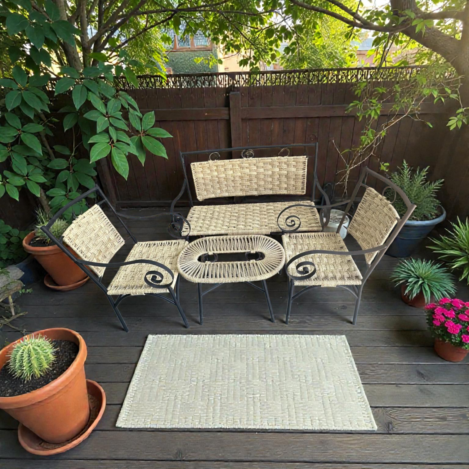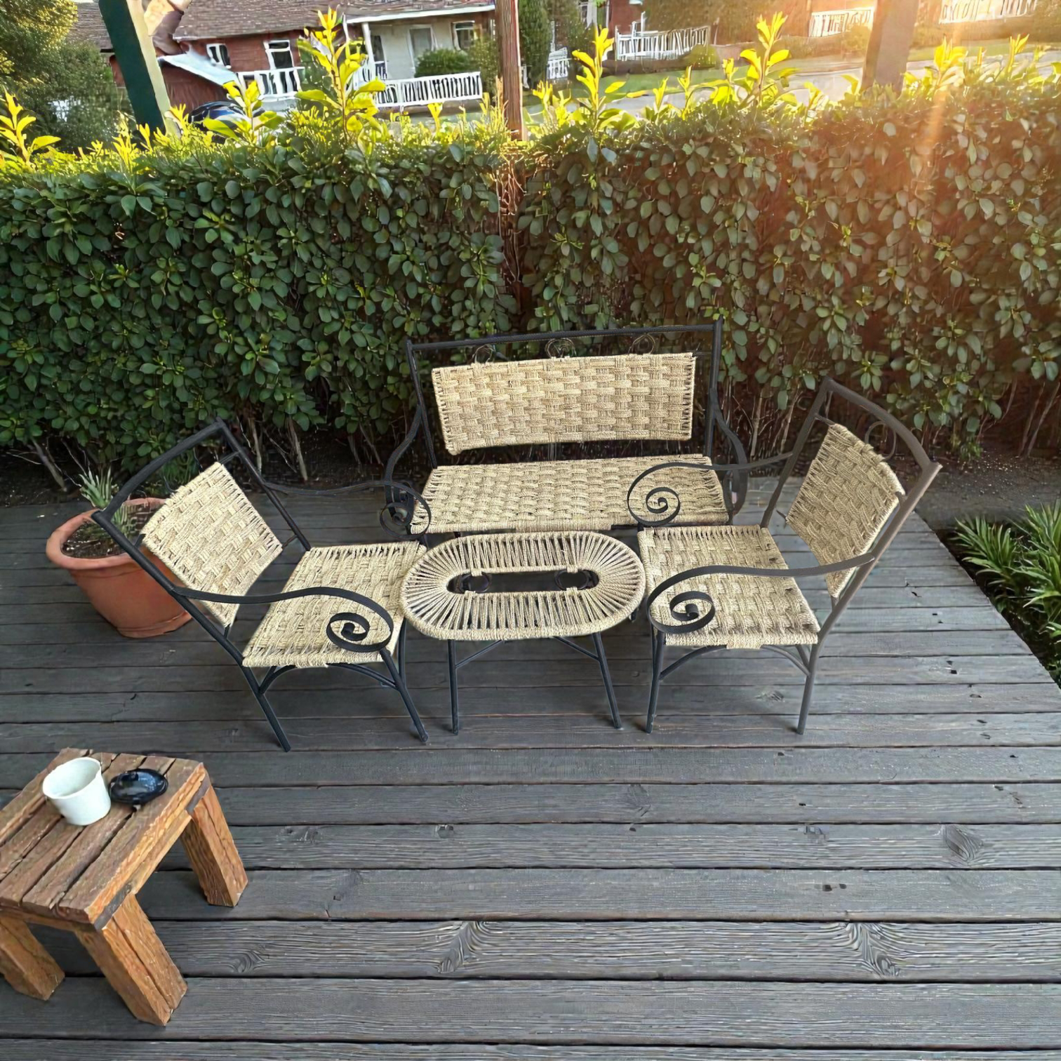 Ensemble de jardin en rotin tressé avec structure en métal, composé d’un banc, de deux chaises et d’une table basse ovale. Design élégant et robuste, idéal pour terrasse, balcon ou véranda. Confortable, stable et adapté à un usage extérieur..