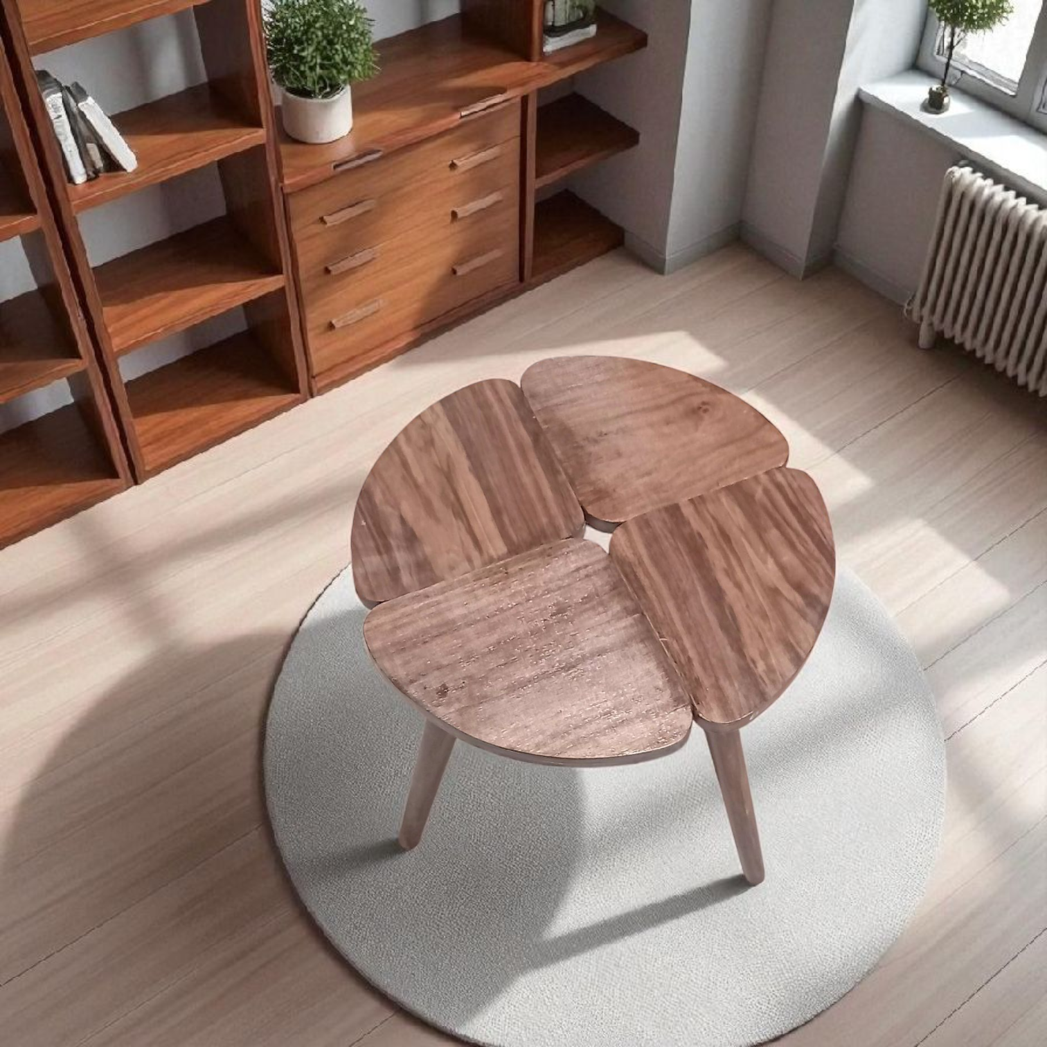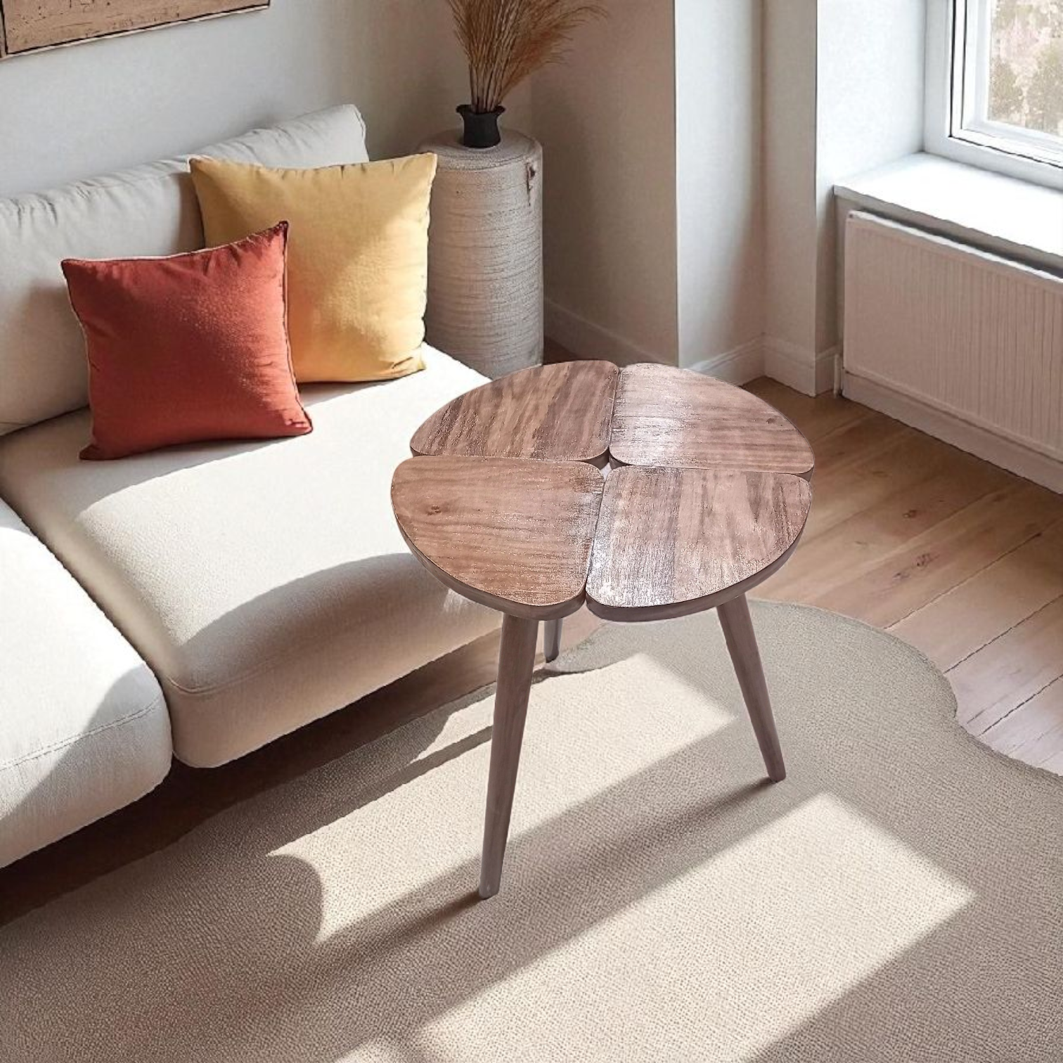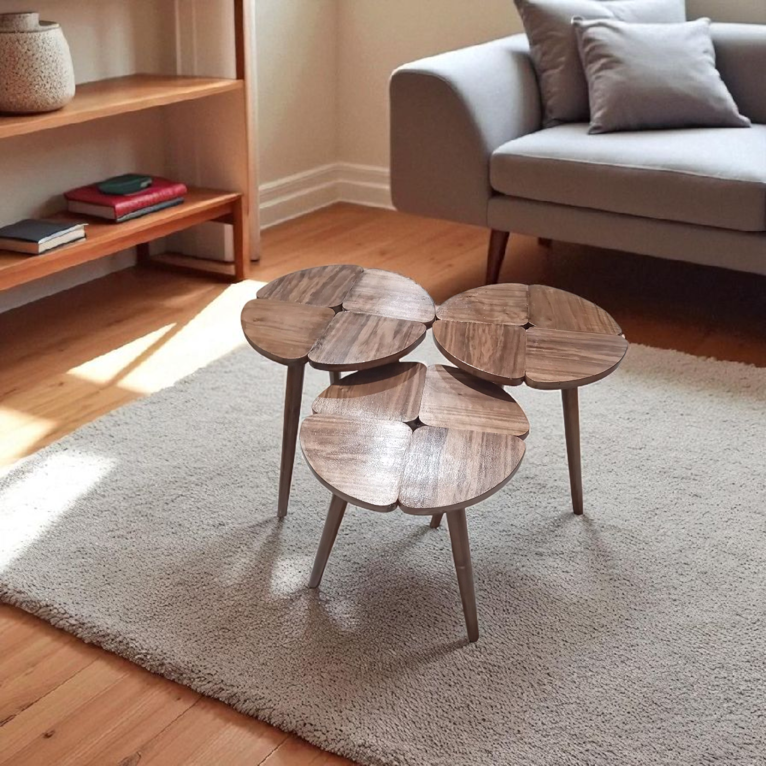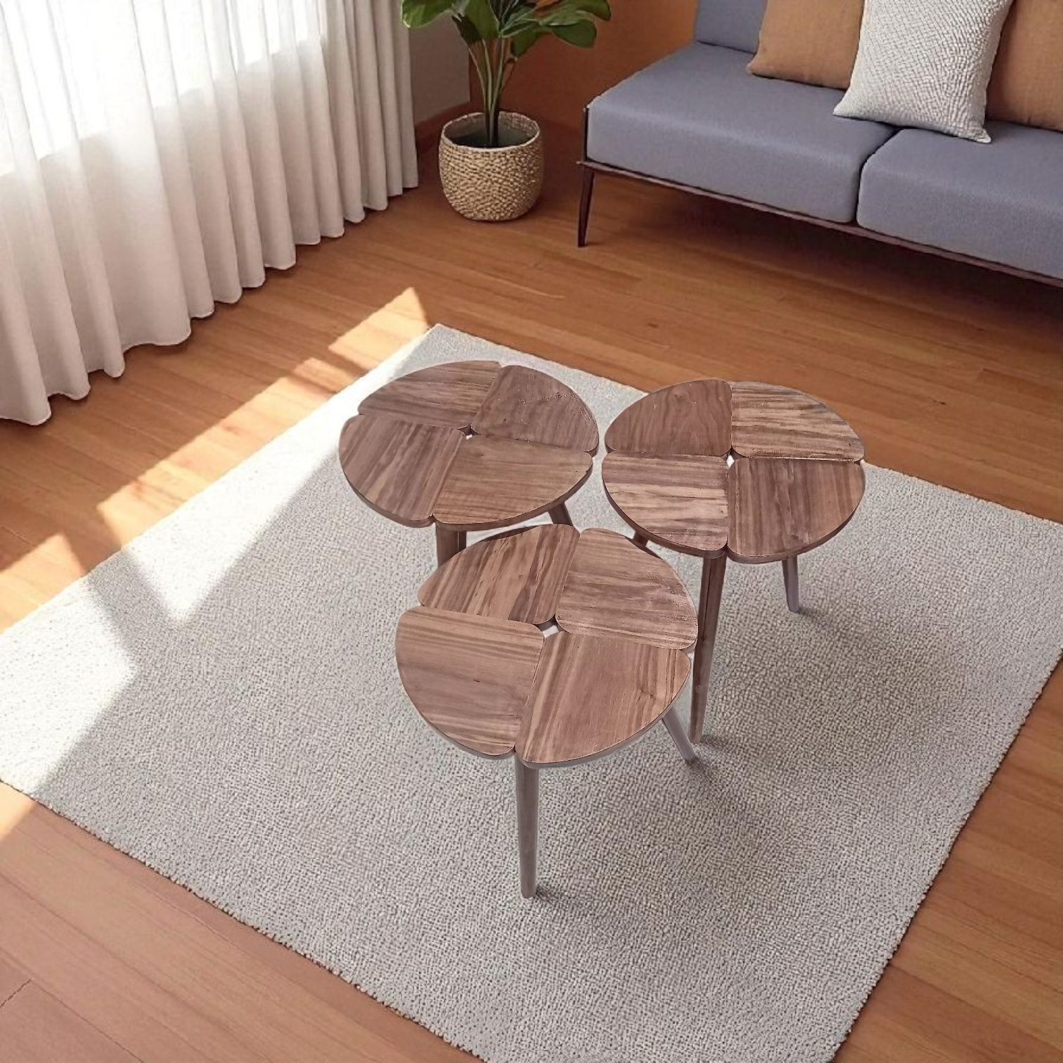 Un set harmonieux et polyvalent : utilisé ensemble, il forme une table basse moderne et originale, et séparément, de pratiques tables d’appoint. La finition noyer apporte une touche chaleureuse et élégante à votre intérieur
