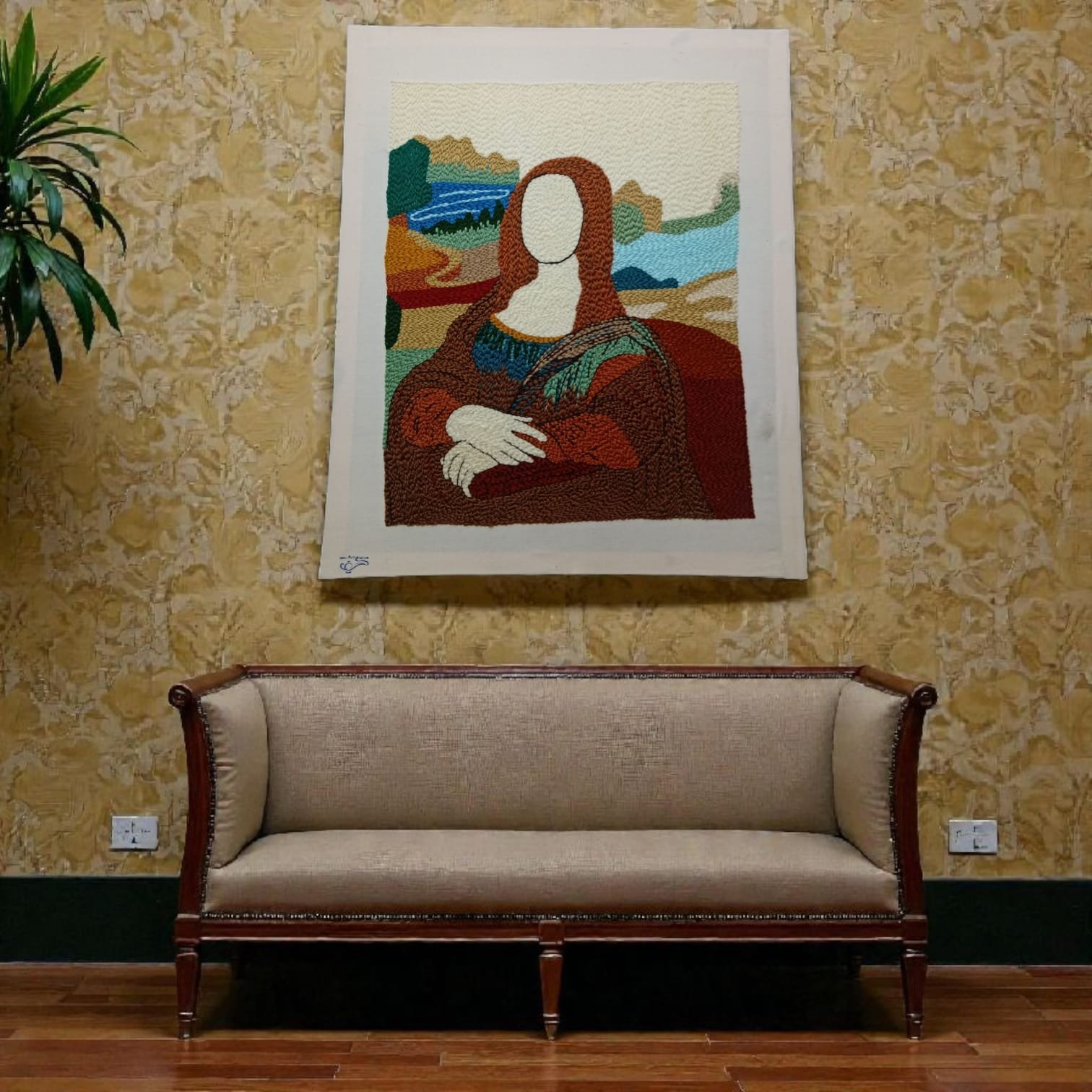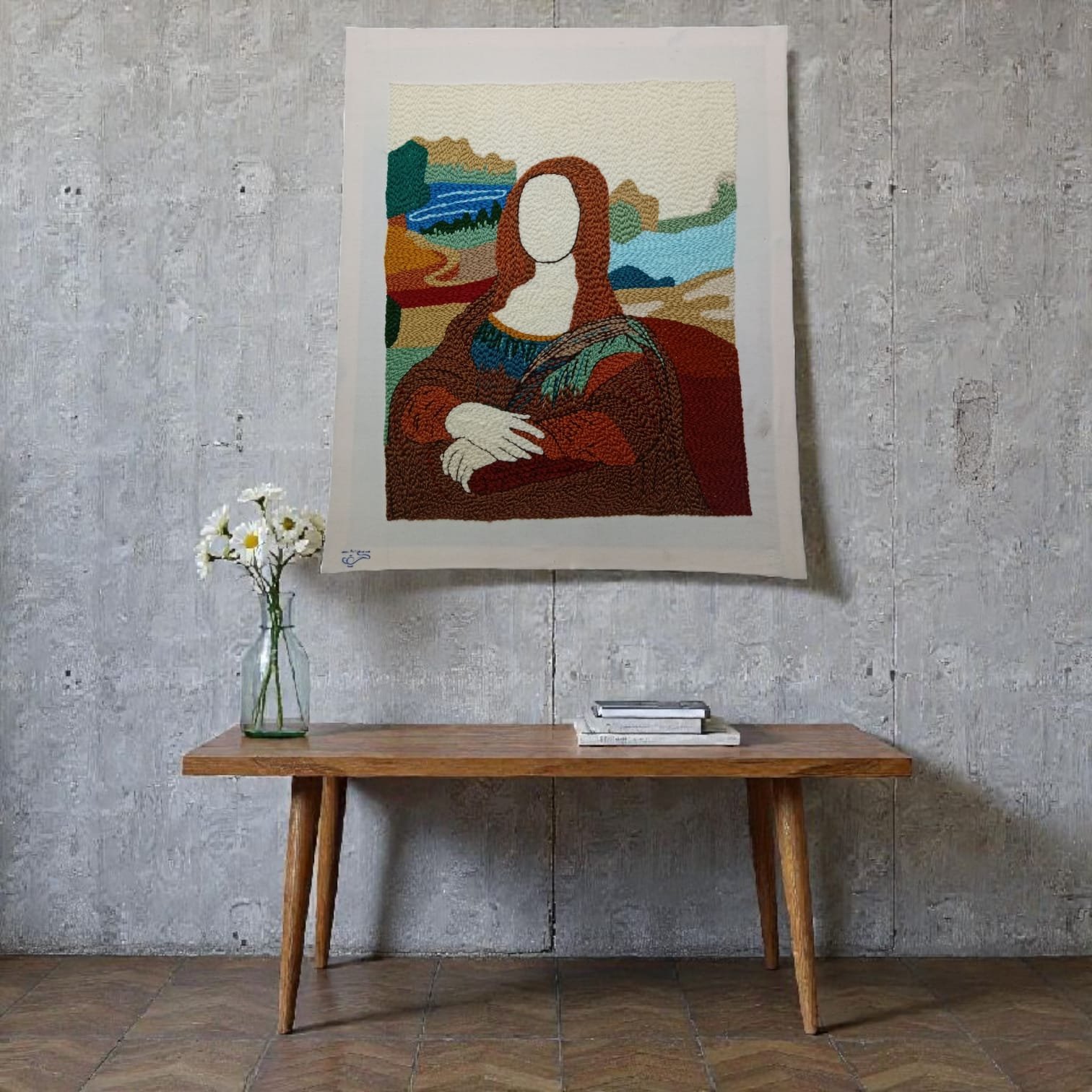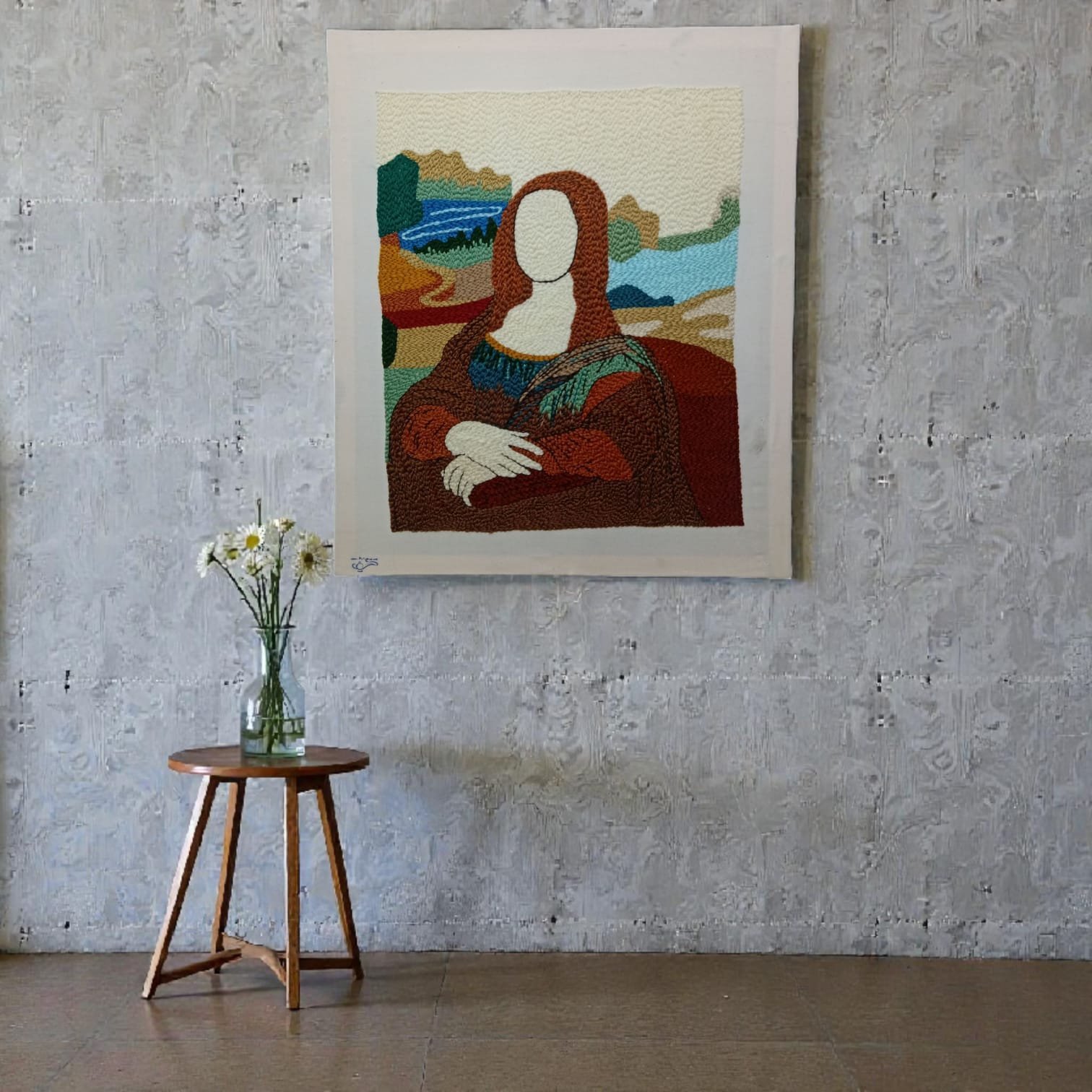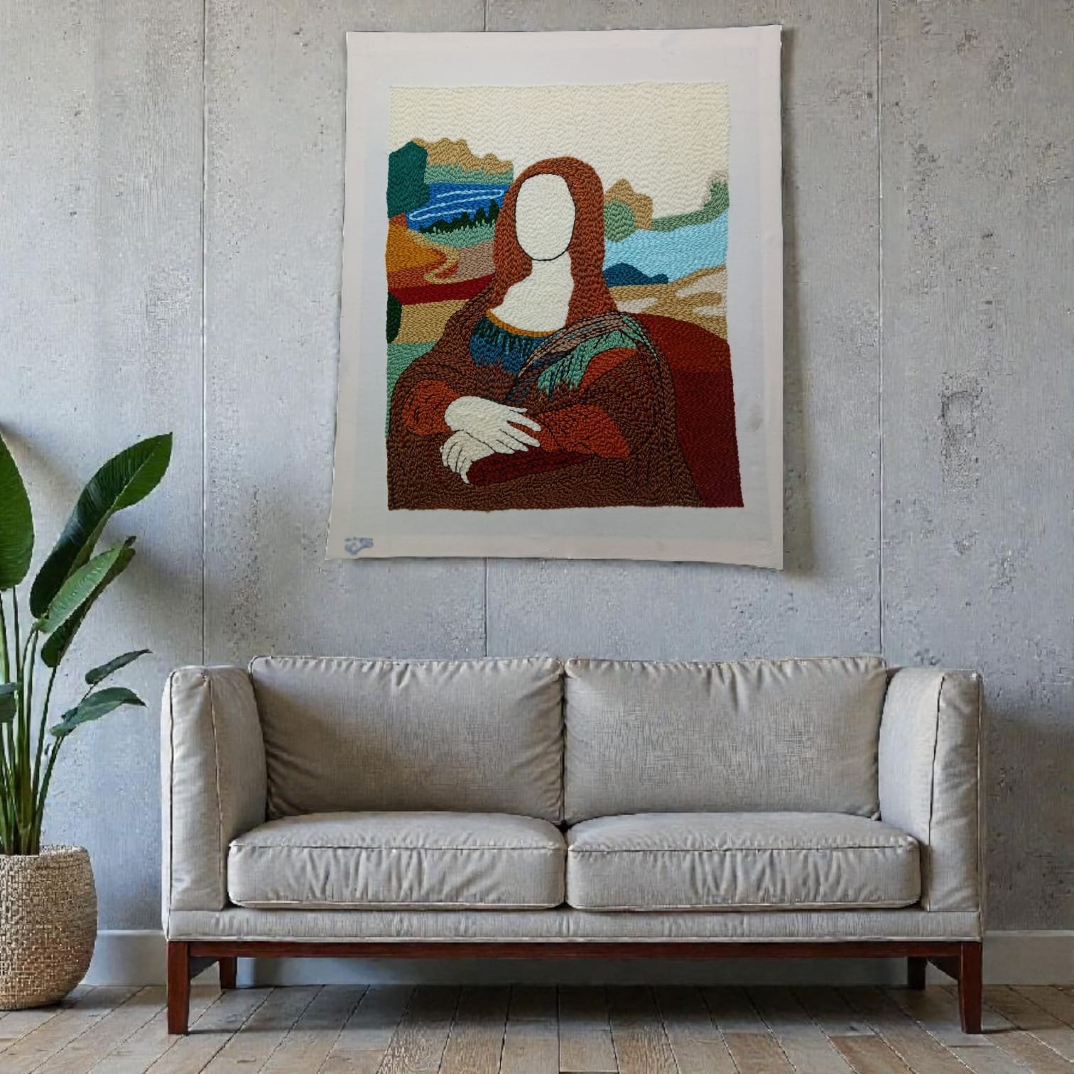 Tableau en broderie artisanale 51×60 cm revisitant une œuvre iconique dans un style textile contemporain. Les formes épurées et les couleurs chaleureuses créent une pièce artistique unique, mêlant tradition et modernité, idéale pour sublimer un intérieur raffiné.