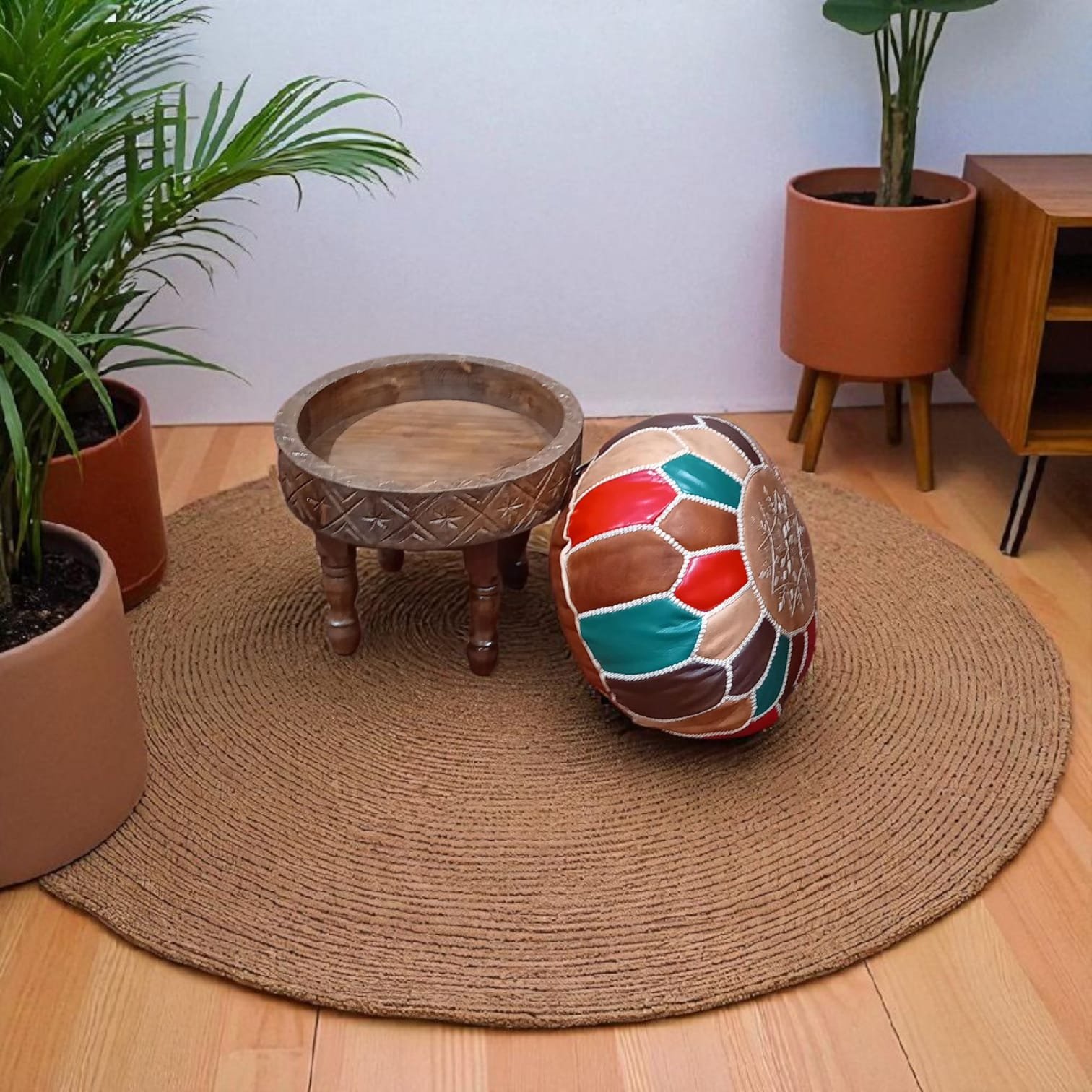 Une pièce artisanale 2 en 1 : à la fois tabouret confortable et petite table d’appoint pratique. Un design unique qui apporte originalité et chaleur à votre intérieur