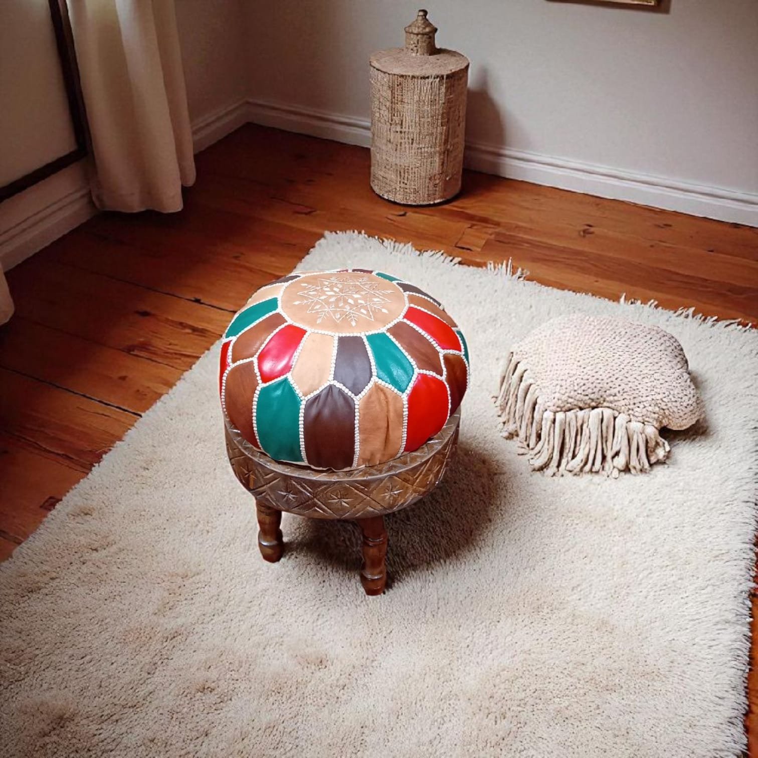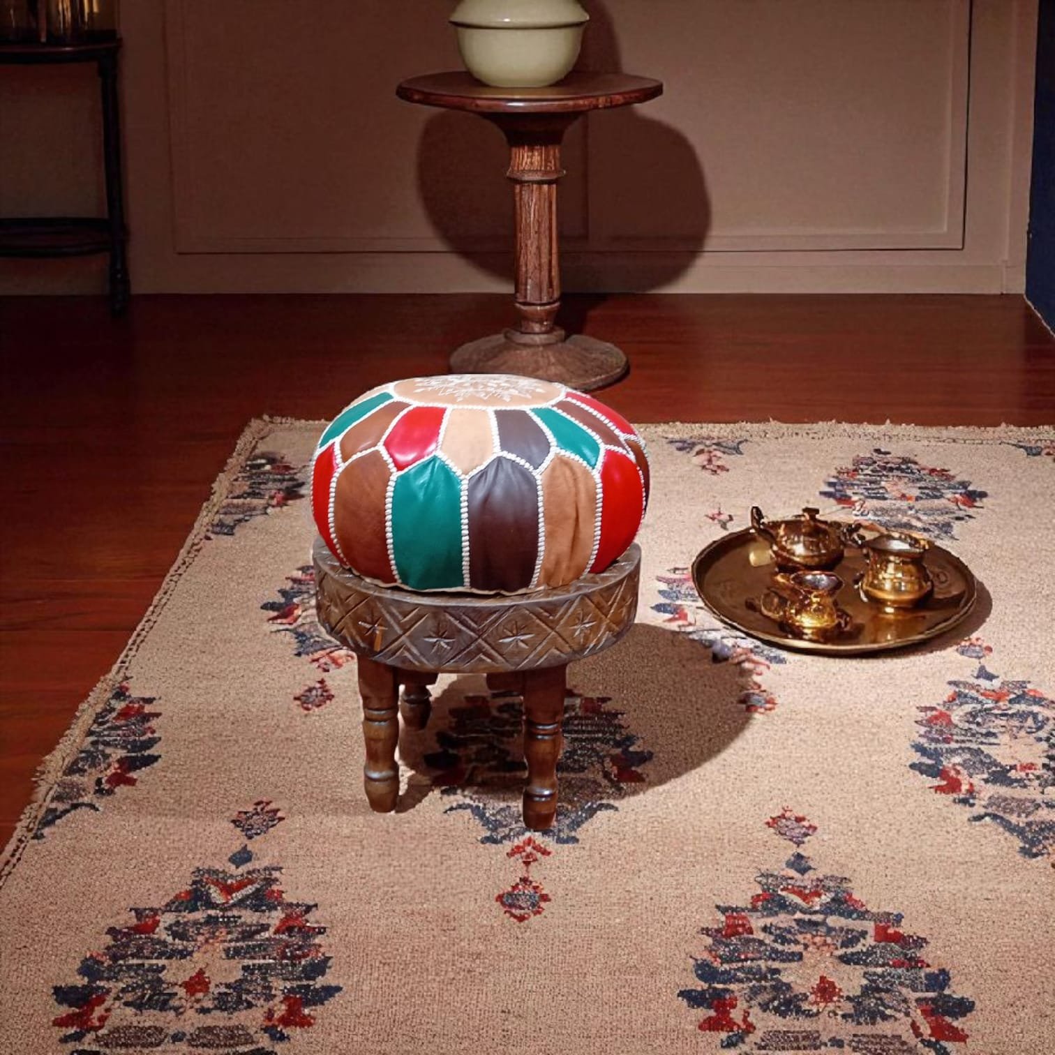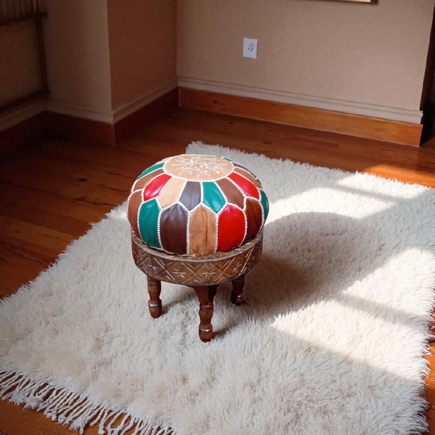 Tabouret en bois avec coussin en cuir multicolore