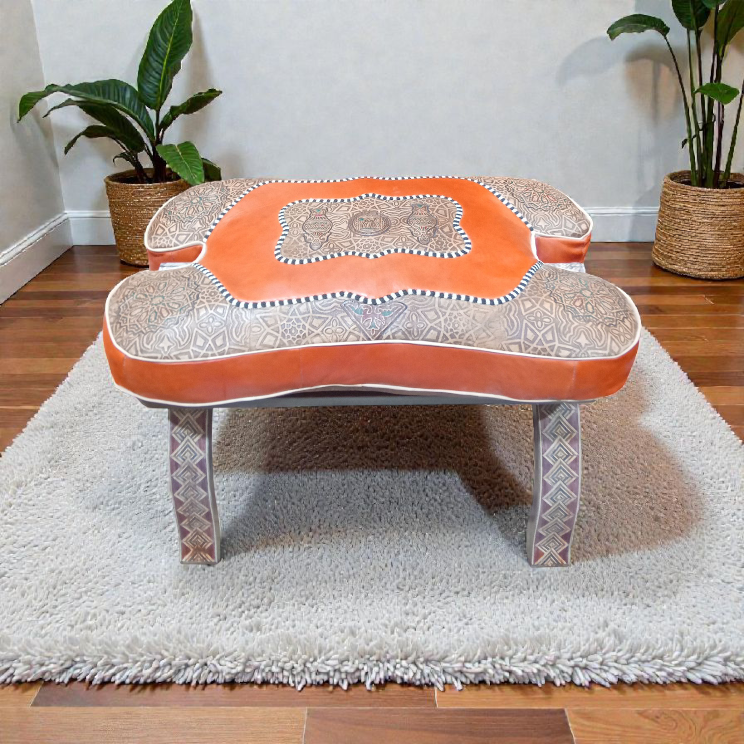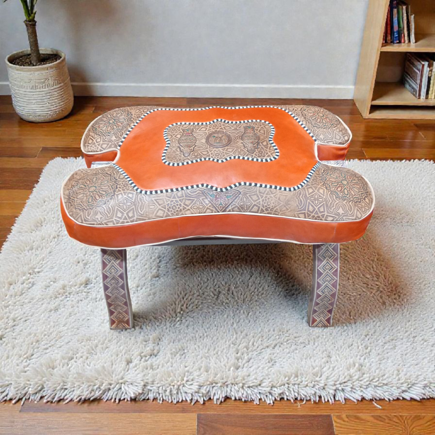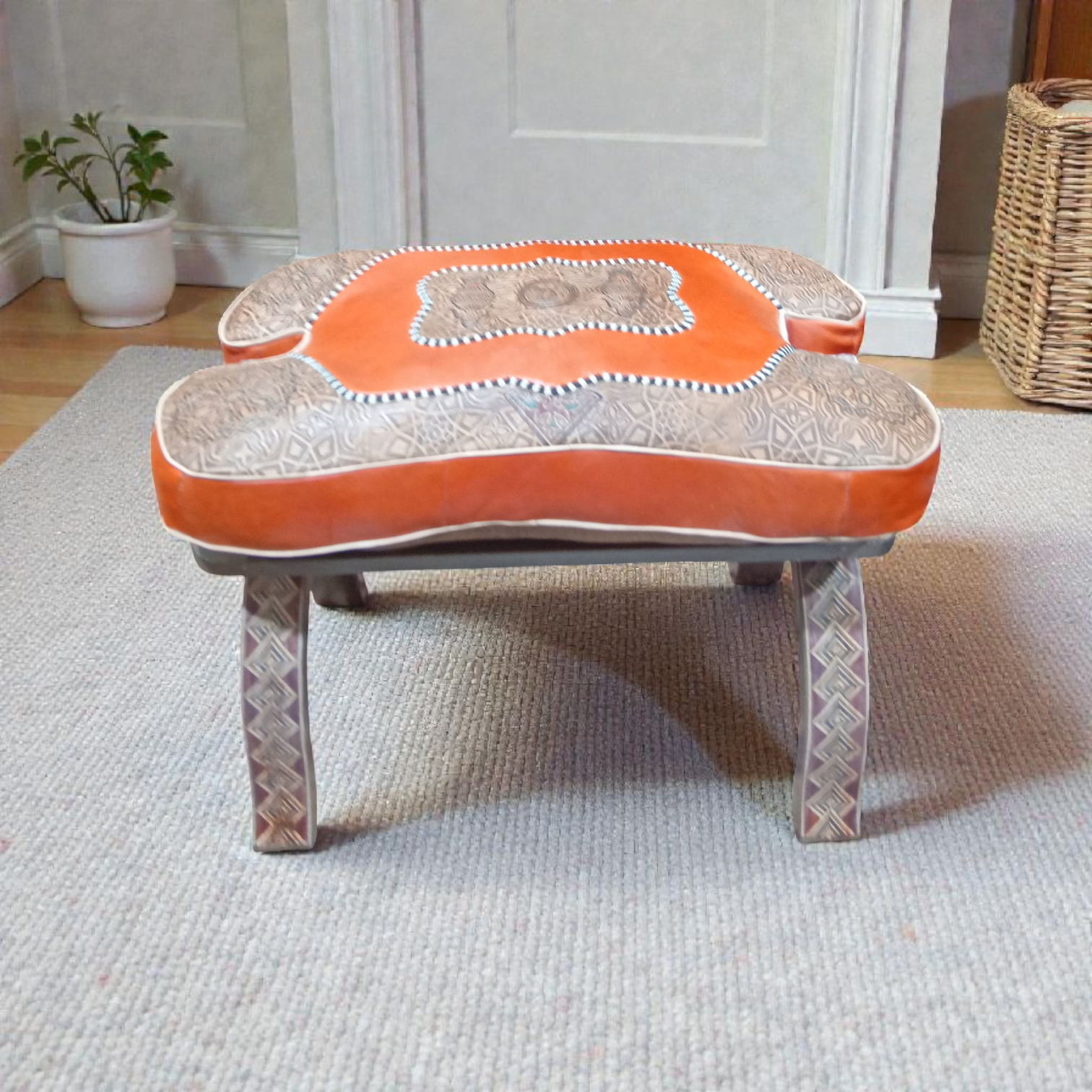✨ Tabouret pliable en bois avec pouf en cuir véritable