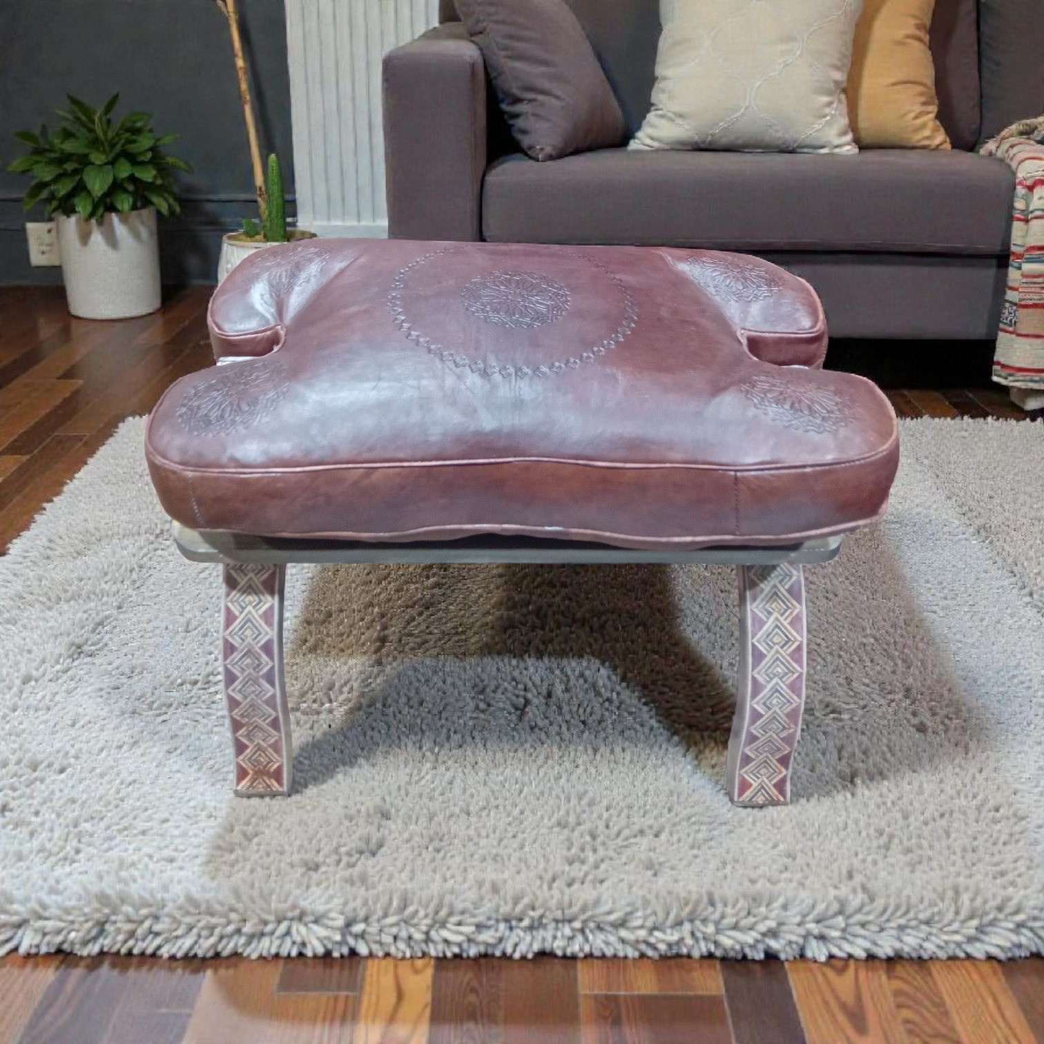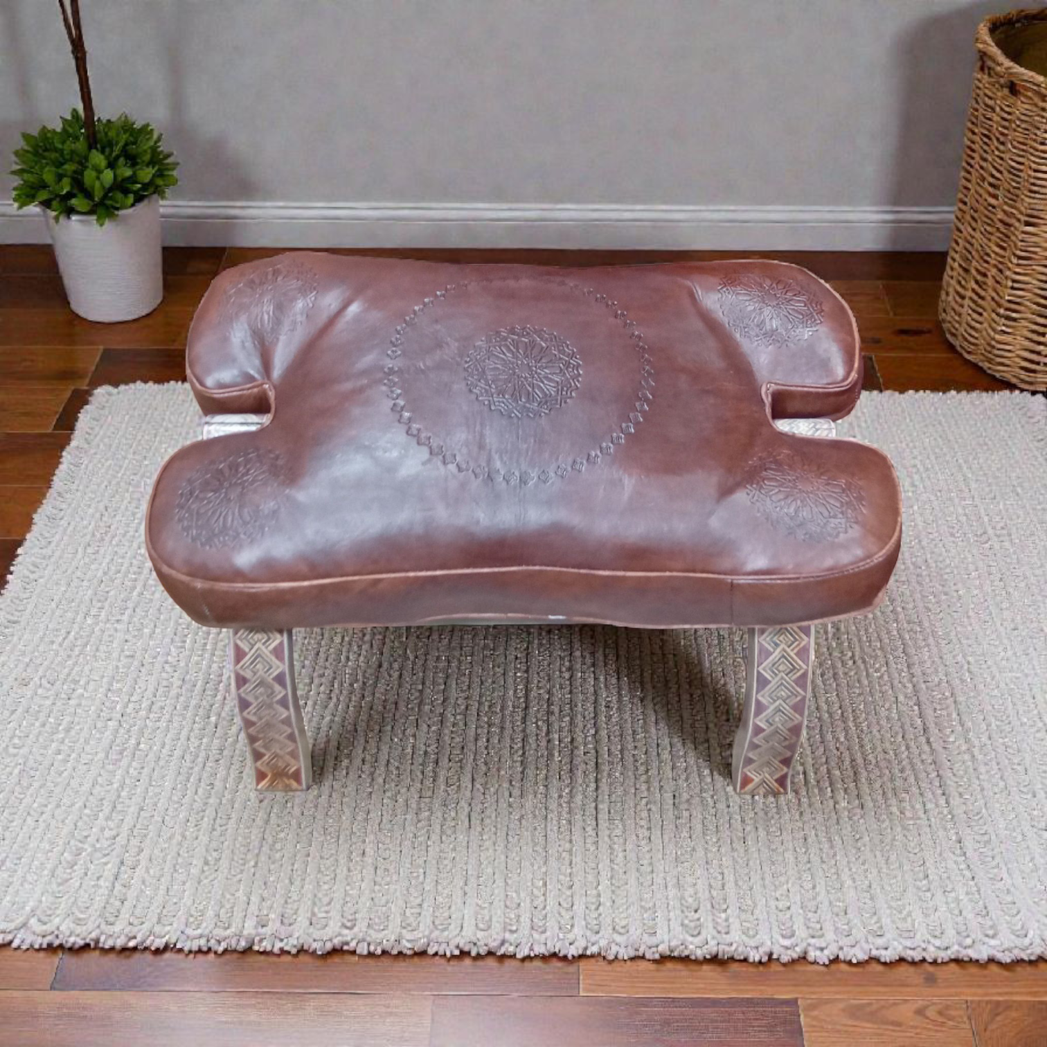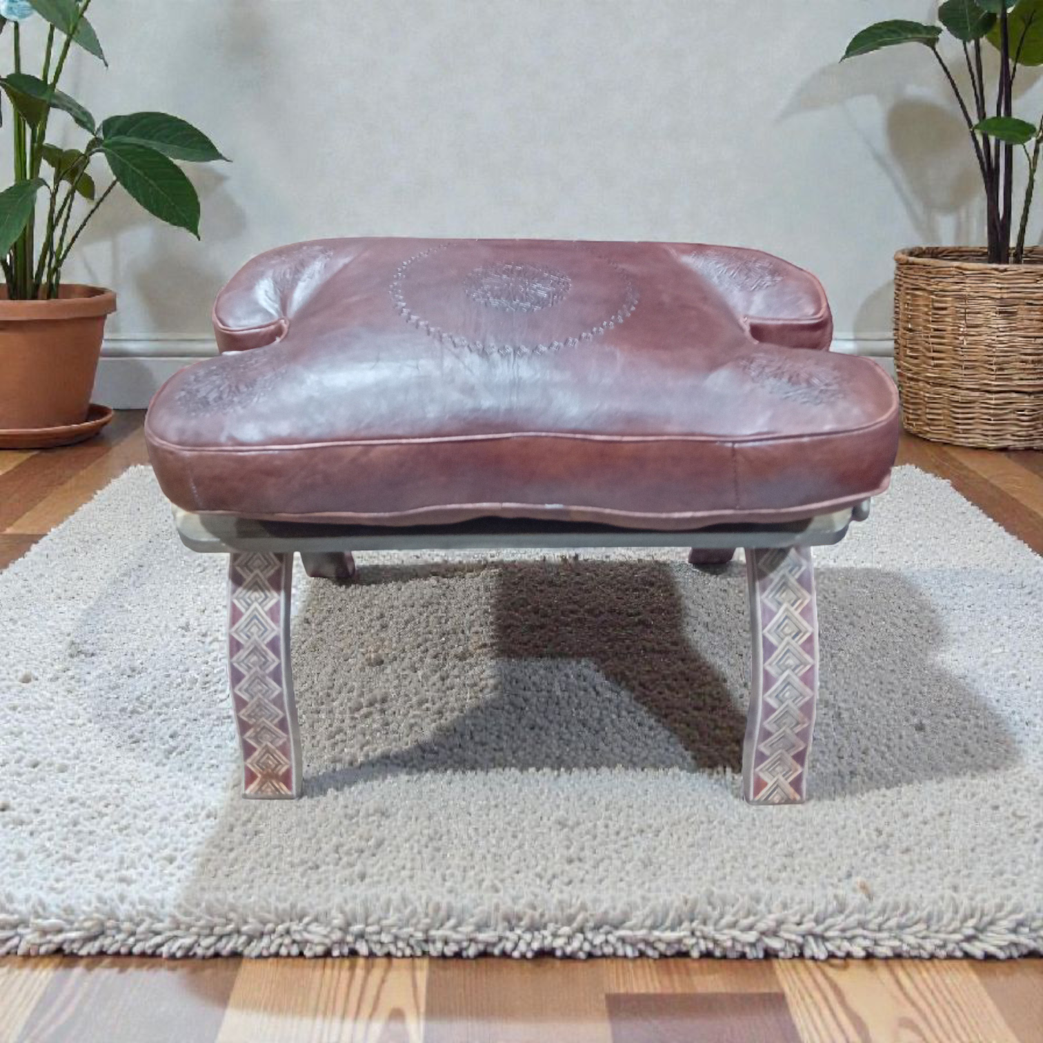 ✨ Tabouret pliable en bois avec pouf en cuir véritable