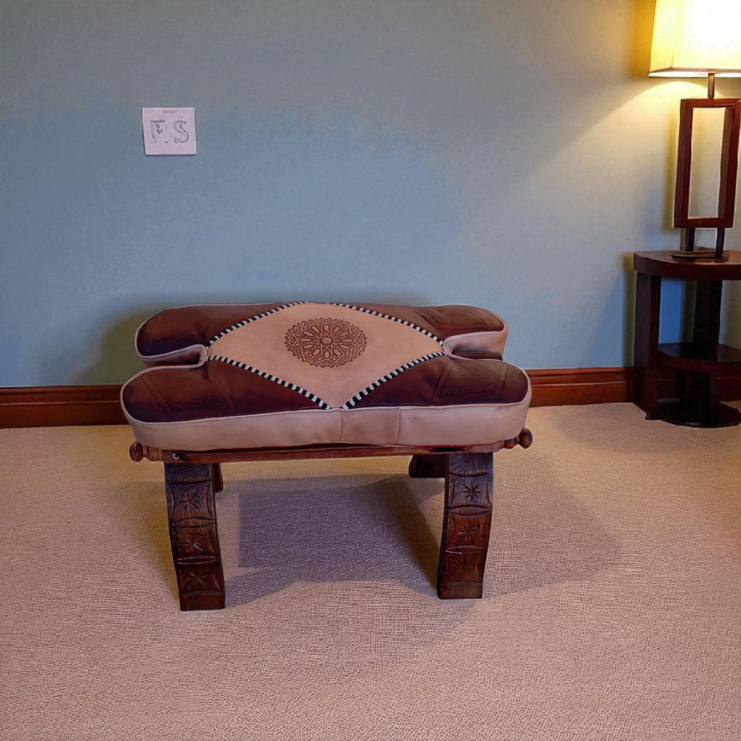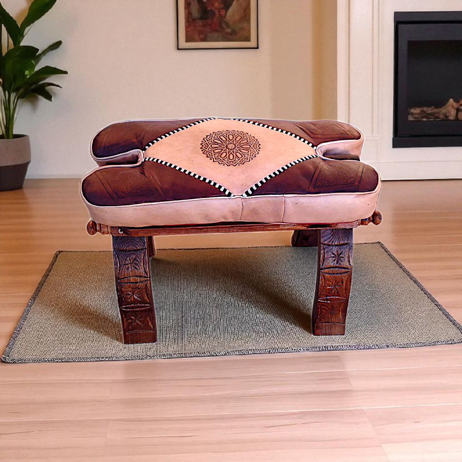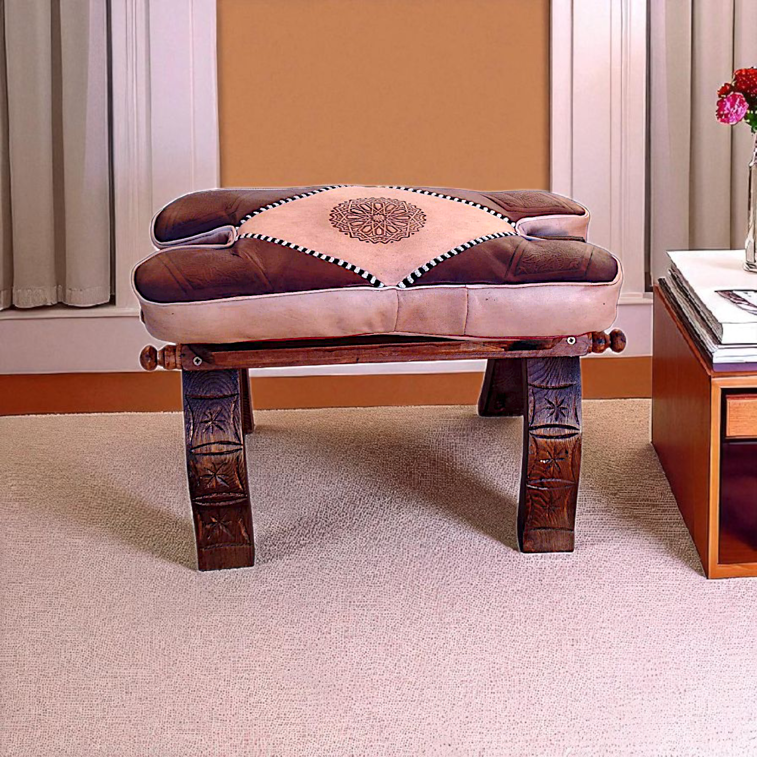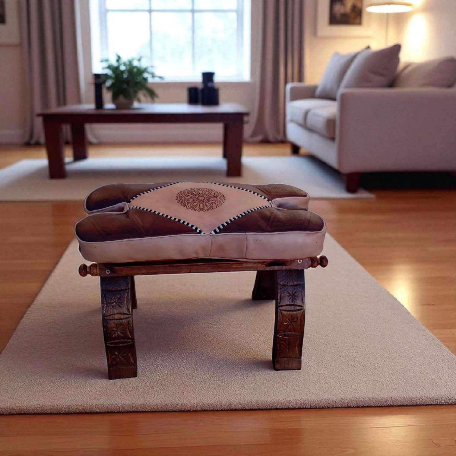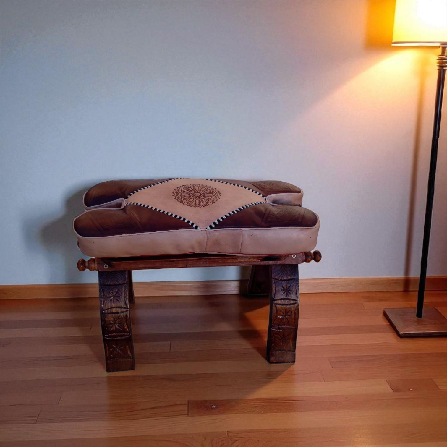 ✨ Tabouret pliable en bois avec pouf en cuir véritable